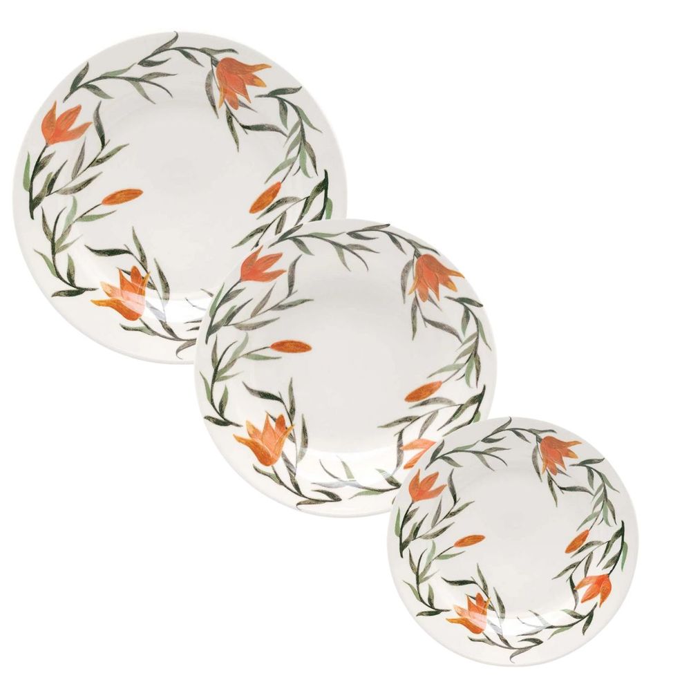 Os lírios são uma das flores mais comuns em jardins e casas brasileiras. Na coleção Donna Lírios, ele vira a estrela principal da decoração. As bordas de cada borda e pires recebem o desenho feito à mão da flor de cor laranja junto de ramos e folhas. As cores são vibrantes e trazem alegria à mesa.